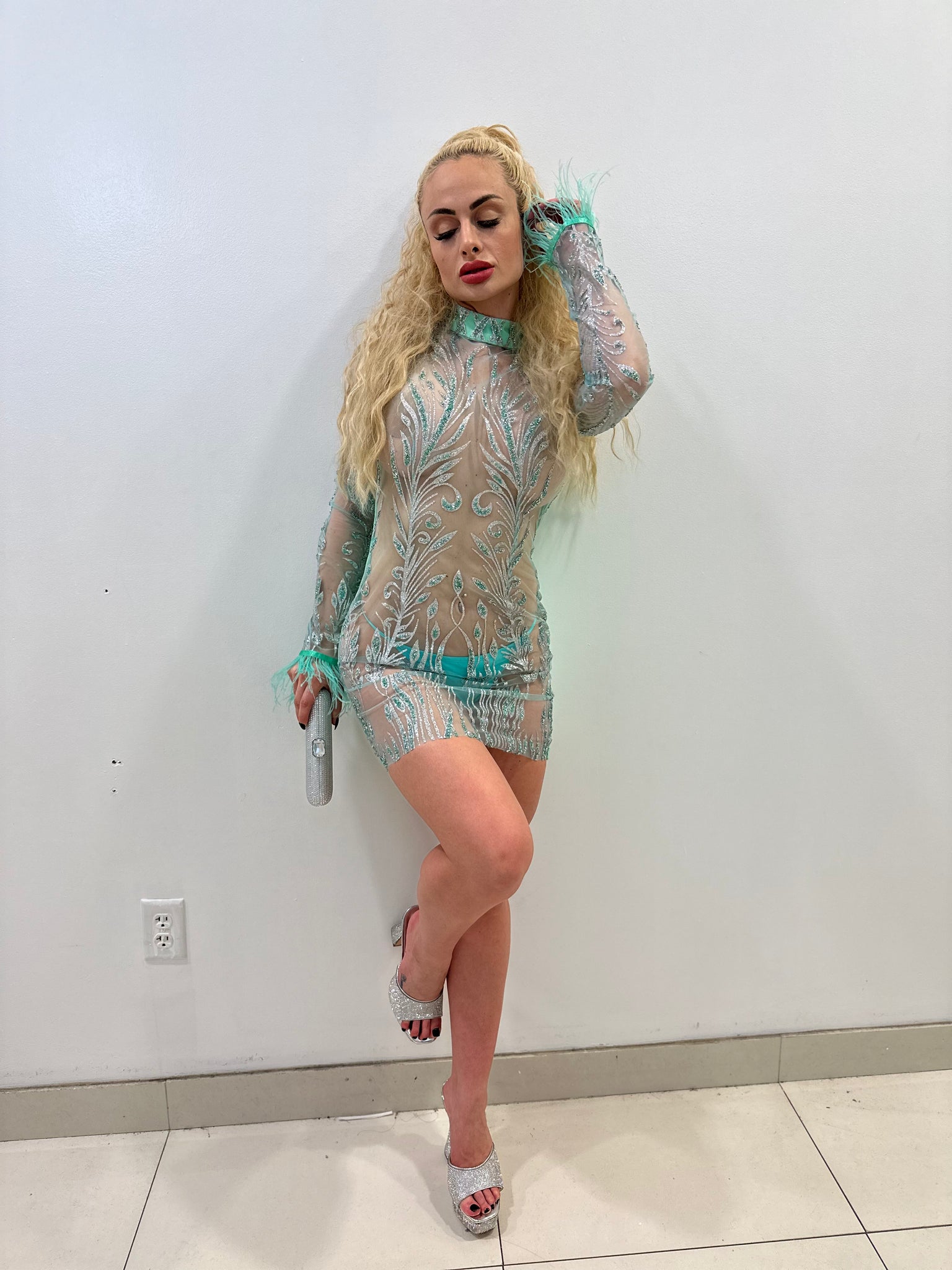 This unique shimmer dress stretches and fits true to size. Model is wearing a small.