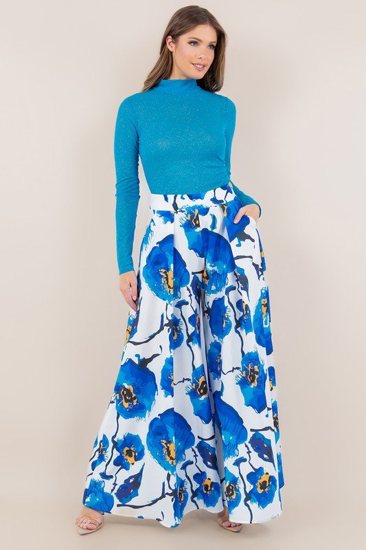 Big Blue Flower Print Wide Leg Palazzo Pants