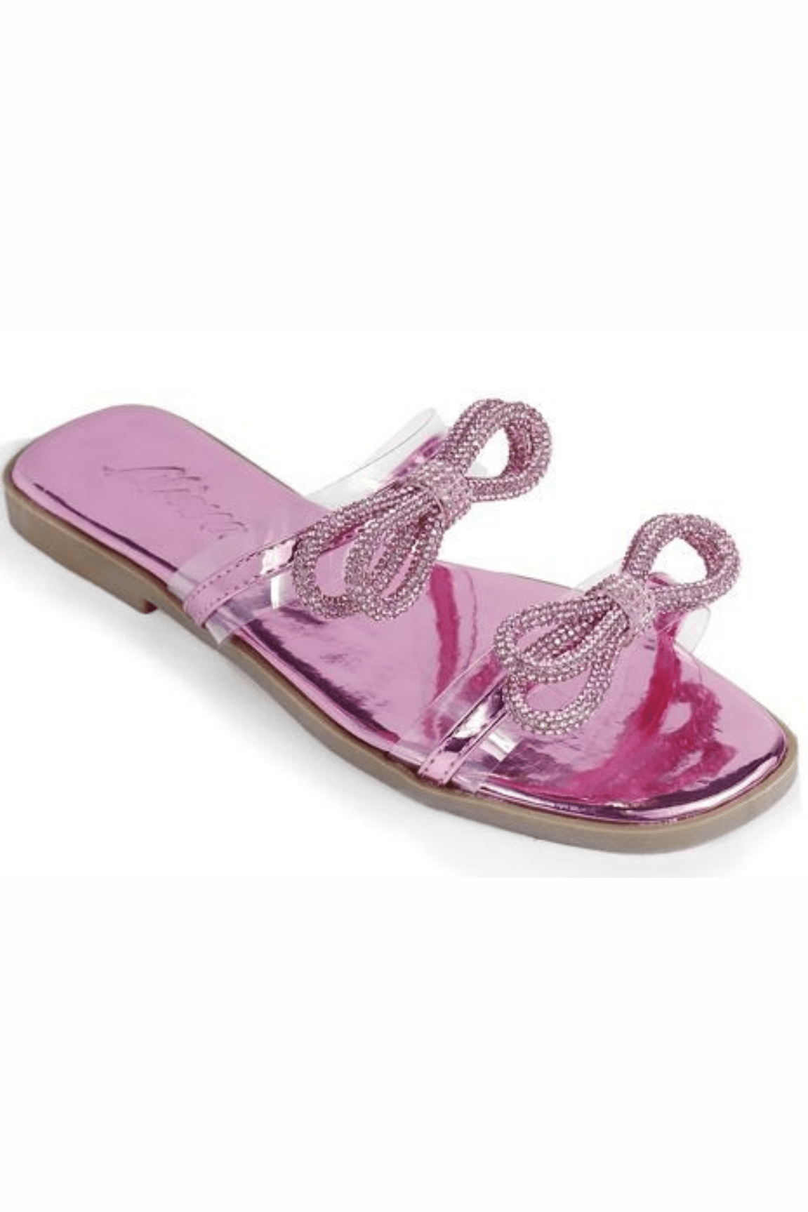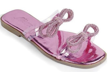 Women Rhinestone Double Bow Clear Strap Slide on Sandals (Pink)